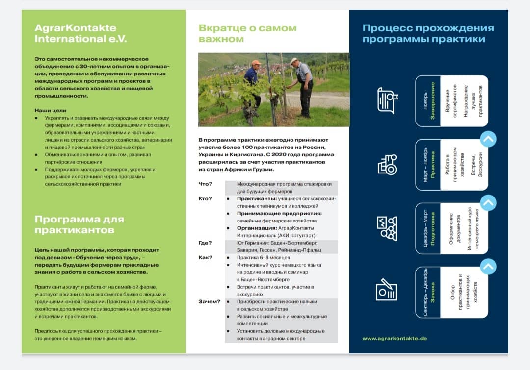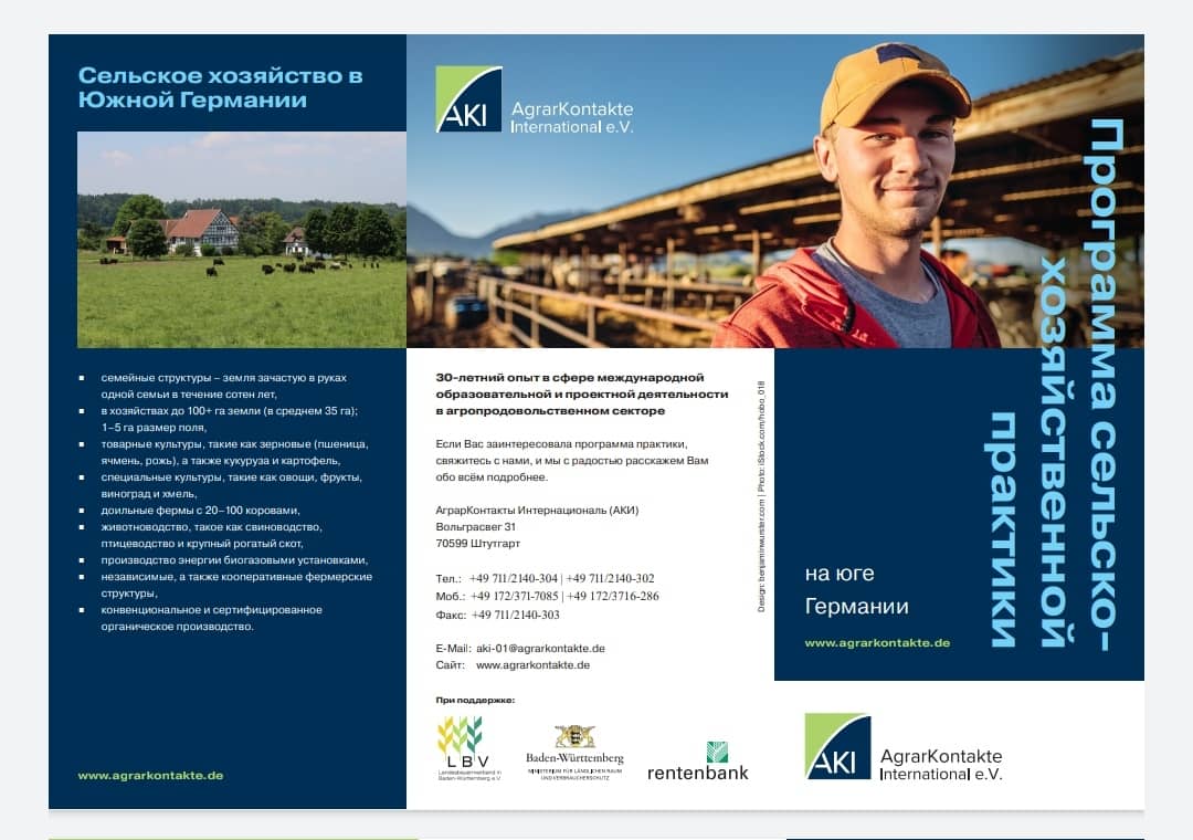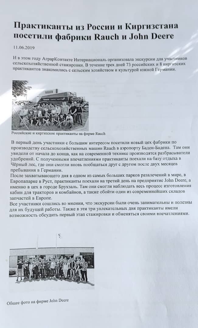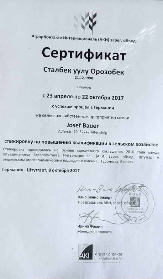 Сельскохозяйственная практика студентов на юге Германии началось в 2015- 2016 учебном году, для студентов ветеринарного и агрономического отделения. За эти 7 лет успешно прошли 8- месячную стажировку 54 студента и по окончании практики получили сертификат по повышению квалификации в сельском хозяйстве. Из них 3 студента, после выпуска по договору со сроком на 2 года были приглашены в Германию и работают на фермах. На сегодняшний день за 2021-2022 учебный год активно готовятся на стажировку уже 15 студентов колледжа.
